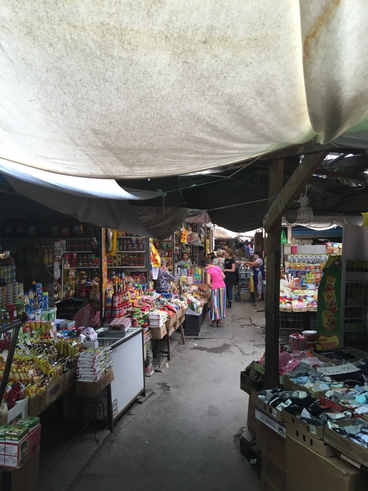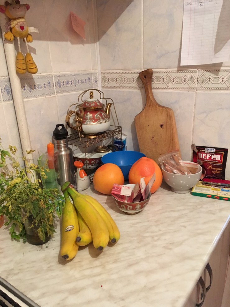 Zwischen der Bushaltestelle und unserer Wohnung ist ein kleiner Lebensmittelbasar. Vor dem Basar sind außerdem immer Straßenstände aufgebaut, an denen Obst, Gemüse, Eier und ein paar andere Kleinigkeiten angeboten werden. Obst und Gemüse, Eier und Brot kaufen wir dort. Den Rest, das heißt Butter, Milch, Joghurt usw. kaufen wir in der Filiale einer lokalen Supermarktkette, die sich fast direkt vor unserer Haustür befindet.