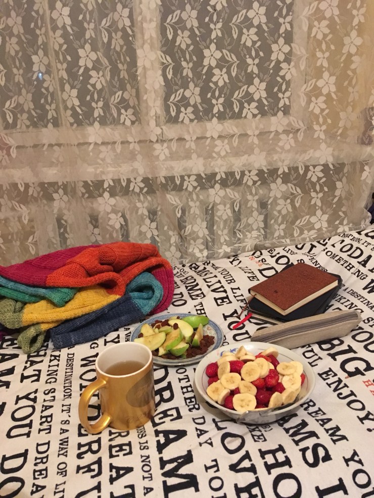 Wir kochen als WG in unserer kleinen Küche mit Gasherd. Anfangs haben wir fast täglich frisch gekocht und Gebrauch von dem sommerlich günstigen und frischen Obst und Gemüse gemacht. Mit dem Winter und dem Sprachkurs, durch den wir drei Tage die Woche erst um 20 Uhr zu Hause sind, sind wir leider ein bisschen fauler geworden und neigen öfter mal zu einfach Brot und Nudeln. Zwei- bis Dreimal die Woche kochen wir allerdings immer noch frisch. Die gemeinsamen Stunden, die wir schon schnippelnd und lachend miteinander in der Küche verbracht haben, gehören sicherlich zu den schönsten des WG-Lebens.