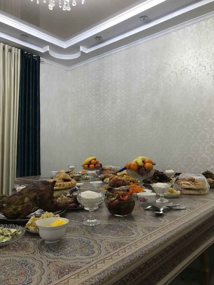 Es gab Borsok (frittierte Teigstückchen) und Plow (zentralasiatisches Reisgericht), die vorher in großen Töpfen für alle zubereitet wurden. Außerdem wurden Salate, selbstgemachte Pferdewurst, Obst, Süßigkeiten und Tee bereitgestellt.